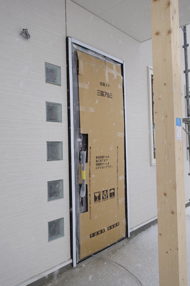 とうとう、十勝にも雪が降ってきましたね。 屋根も壁も張り終え、 外回りの工程には ほとんど影響無かったので良かったです。 入口扉が付きました。 少し入口が分かりづらいかもしれませんが このドアが入口になります。