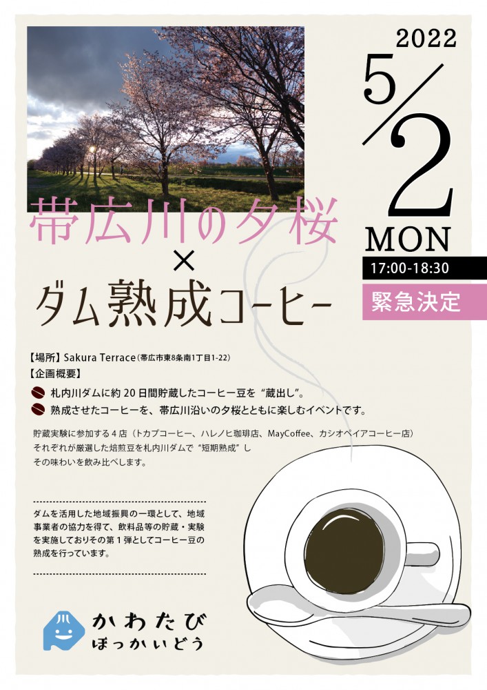 「かわたびほっかいどう」という北海道開発局が取り組んでいる水辺の観光振興の一環で、ダムを活用した地域振興としてダムで熟成したコーヒーの試飲会を5月2日(月)17時〜18時30分に行います。 この熟成実験に参加した焙煎事業者は、中札内村/トカプコーヒー、ハレノヒ珈琲店、MayCoffee、音更町/カシオペイヤコーヒー店の4事業所。それぞれがダムでの熟成を見込んで焙煎した豆の飲み比べをお楽しみいただけます。 まだ桜が残っていたら夕桜とコーヒーという素敵な夕暮れになりそうです。
